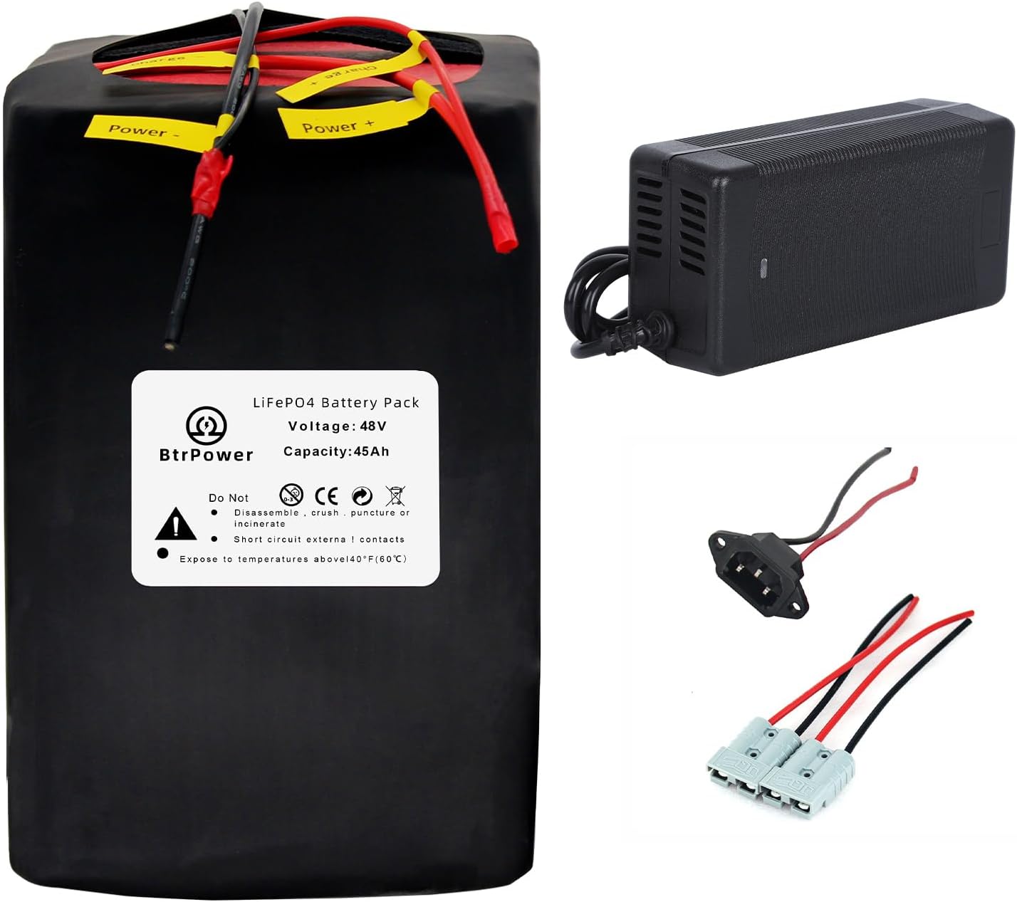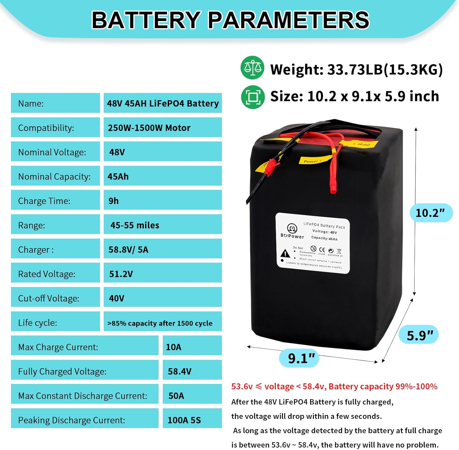 BtrPower Ebike Battery 48V 45AH LiFePO4 Battery Pack with 5A Charger 50A BMS