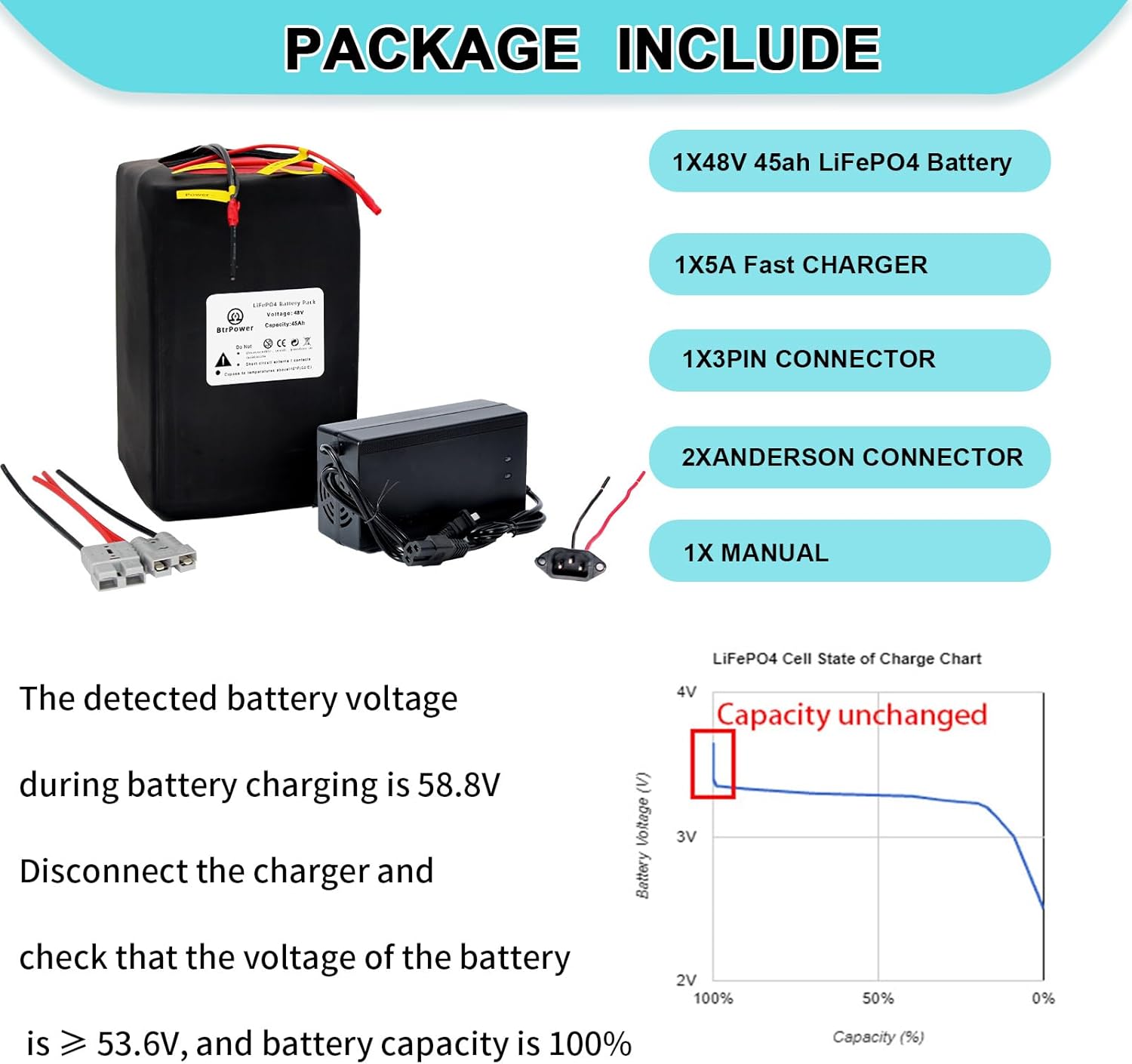 - 48V 45AH LiFePO4 Battery can work well for 250W-1500W ebike motor